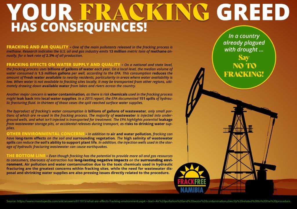 Cependant, les activités de prospection, avec les forages d'exploration, les études sismiques, la construction de routes d'accès et de réservoirs d'eau, ont déjà causé des dommages écologiques. La population locale se plaint notamment d'avoir été ignorée. Des tribunaux se sont penchés sur le cas de ReconAfrica en Namibie, au Canada et aux États-Unis.